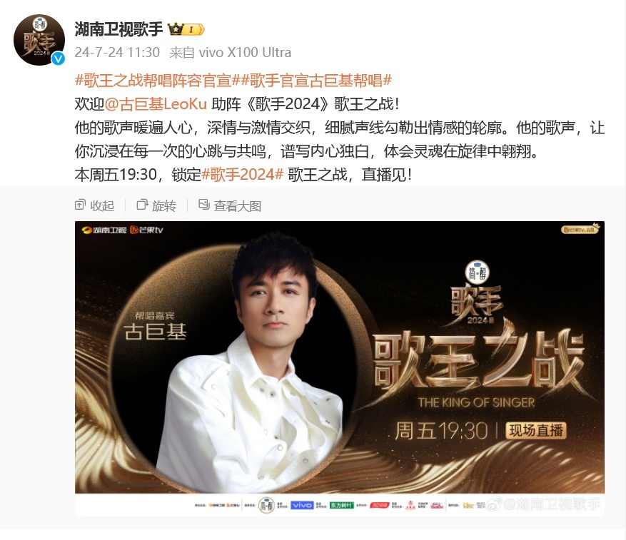 接着,节目组官博宣布古巨基帮唱:“欢迎古巨基助阵《歌手2024》歌王之战!他的歌声暖遍人心,深情与激情交织,细腻声线勾勒出情感的轮廓。他的歌声,让你沉浸在每一次的心跳与共鸣,谱写内心独白,体会灵魂在旋律中翱翔。”