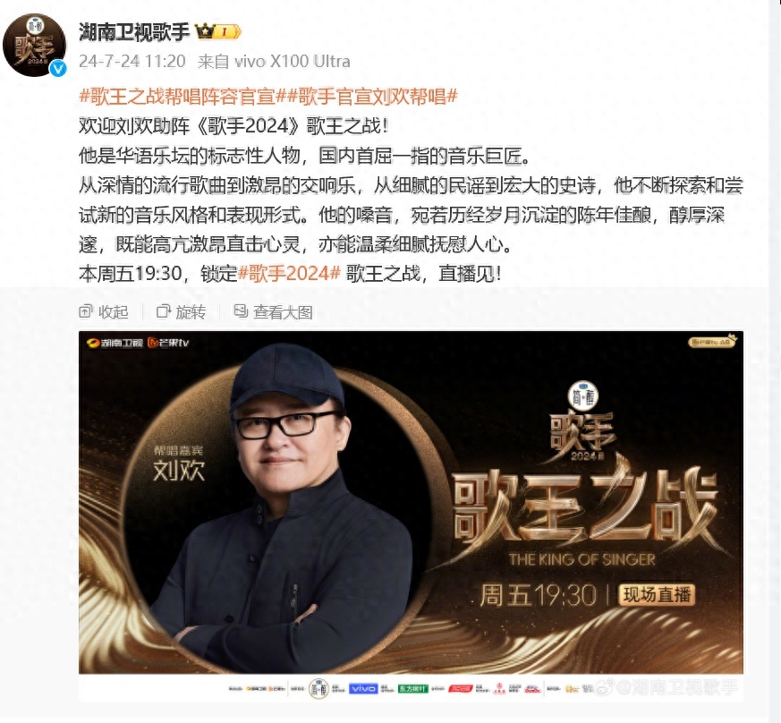 节目组官博发文:“欢迎刘欢助阵《歌手2024》歌王之战!他是华语乐坛的标志性人物,国内首屈一指的音乐巨匠。从深情的流行歌曲到激昂的交响乐,从细腻的民谣到宏大的史诗,他不断探索和尝试新的音乐风格和表现形式。他的嗓音,宛若历经岁月沉淀的陈年佳酿,醇厚深邃,既能高亢激昂直击心灵,亦能温柔细腻抚慰人心。”