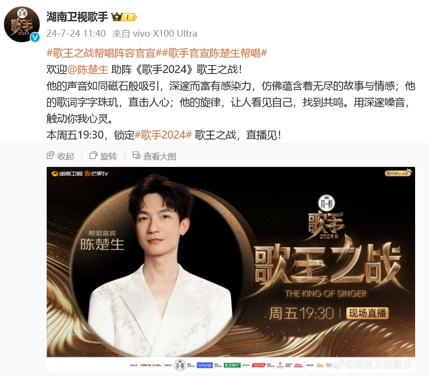 陈楚生也将登台帮唱:“欢迎陈楚生助阵《歌手2024》歌王之战!他的声音如同磁石般吸引,深邃而富有感染力,仿佛蕴含着无尽的故事与情感;他的歌词字字珠玑,直击人心;他的旋律,让人看见自己,找到共鸣。用深邃嗓音,触动你我心灵。”