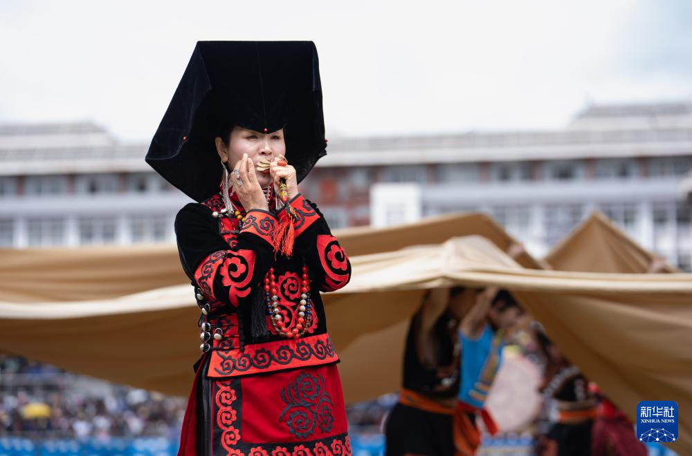 7月22日,在布拖县火把广场举行的传统火把节开幕式上,一位非遗传承人在展演彝族口弦。
