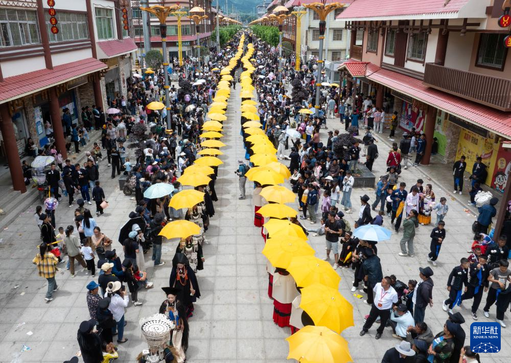 7月22日,在传统火把节银饰、服饰展演活动中,当地群众身着彝族传统服饰走在布拖县城大街上(无人机照片)。
