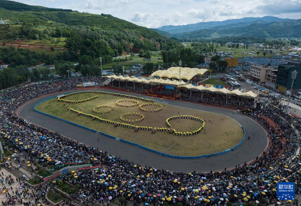 7月22日,在布拖县火把广场举行的传统火把节开幕式上,表演队伍展演朵洛荷(无人机照片)。