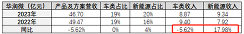 数据显示,2023年,华润微产品及方案收入同比下降5.62%。其中,车类收入占比仍保持19%不变。这也就意味着,2023年,其车类收入也同比-5.62%,已出现下降。