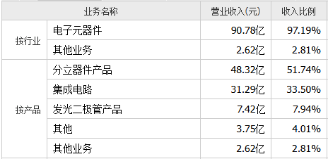 2023年,士兰微实现营收93.40亿,其中分立器件产品占51.74%,集成电路占33.50%,发光二极管产品占7.94%。