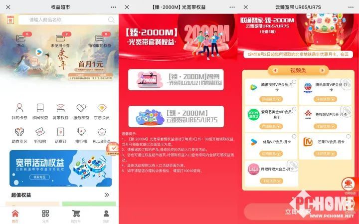 拥有北京联通2000M宽带的情况下,打开中国联通App,点击首页的权益超市,滑动底部的banner图,选择宽带活动权益,选择光宽带U20/U21档套餐权益,即可免费领取腾讯体育、央视频等VIP会员月卡。