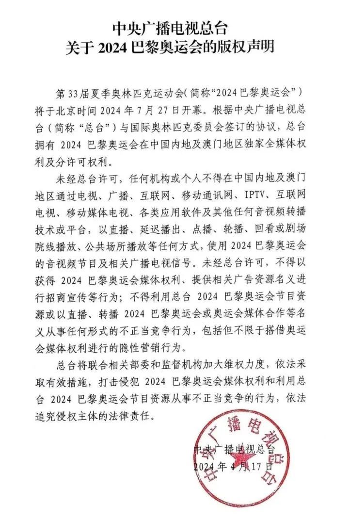 为了收益最大化,央视也采取版权授权的方式,向中国其他视频平台,包括咪咕文化科技有限公司、抖音集团、北京快手科技有限公司、腾讯公司等,分享巴黎奥运会音视频内容。