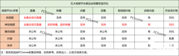 对比了央视频、咪咕视频、腾讯视频、抖音和快手五大平台后,PChome发现央视频和咪咕视频在提供全面的奥运会观看权益方面表现突出,均支持直播、转播、点播、回看、短视频。不过央视频的月会员费为30元,相对较高。相比之下,咪咕视频不仅提供全面的观看权益,月会员费仅为18元,性价比更高。