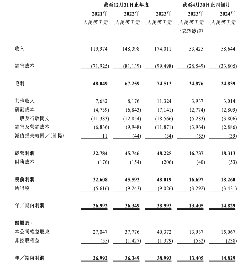 据招股书,2021年-2023年,众淼控股实现收入分别为1.2亿元、1.48亿元、1.74亿元;年内利润分别为2699.2万元、3634.9万元、3899.3万元。