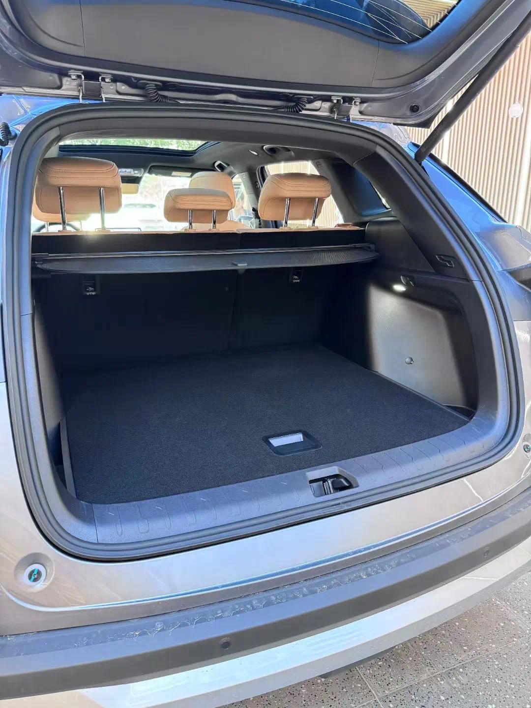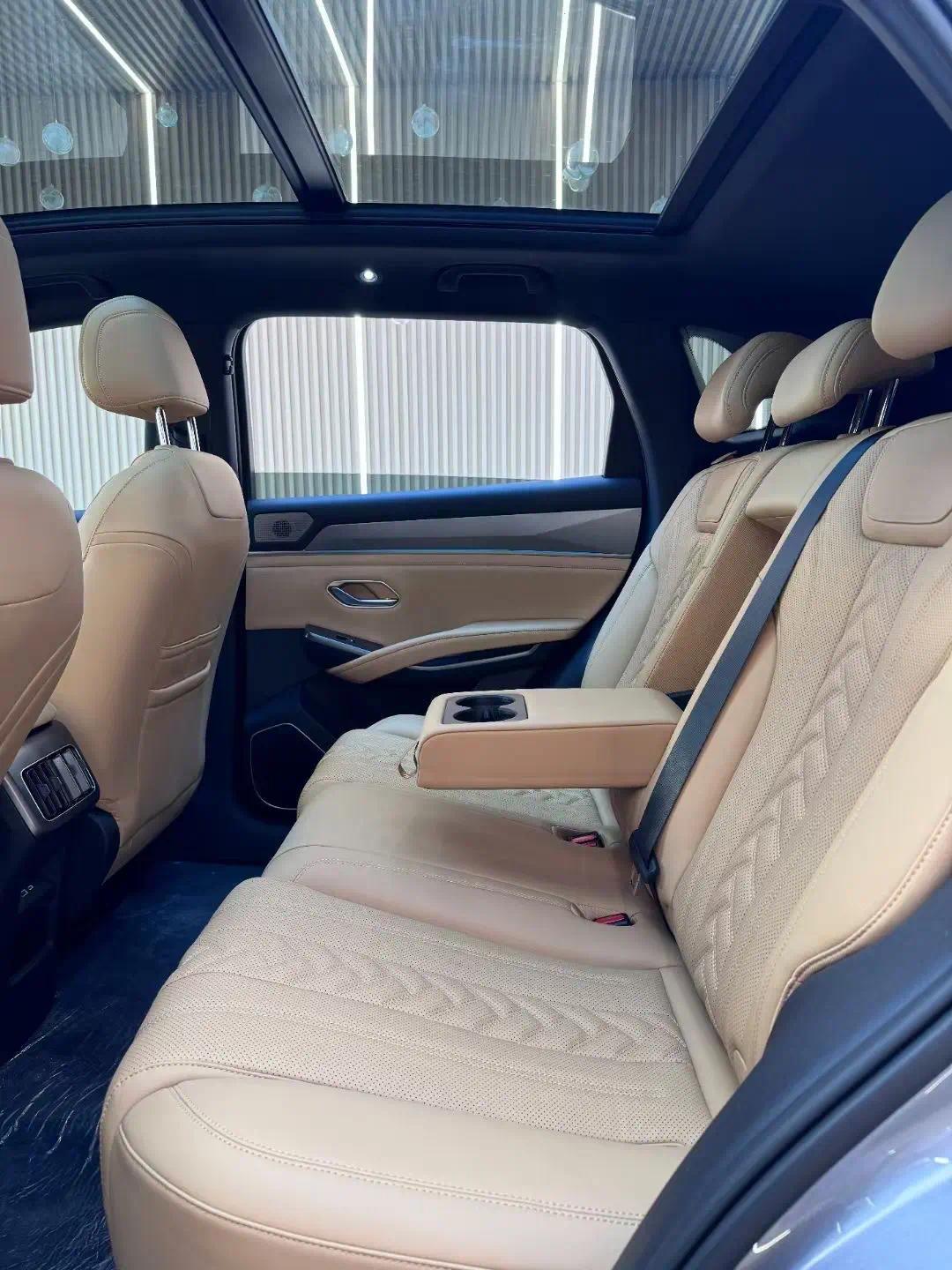 展车的座椅采用浅棕色面料,相比常见的黑色看起来似乎更高级一些,后排空间挺宽敞,全景天窗的面积也挺大,基本延伸到后排乘客头顶。后备厢空间还行,放点大小件没有问题。