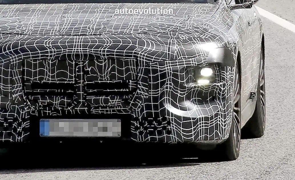 咱们放大来看,前两双肾的结构还在,尺寸似乎有所收敛,并没有像现款这样那么夸张。但是从伪装贴纸的状态来看,有可能变成横向的布局。而两侧的灯光部分,只露出了前照灯,似乎是独立的单元,由横向布局转变为竖向,不排除有重新设计的日行灯带。