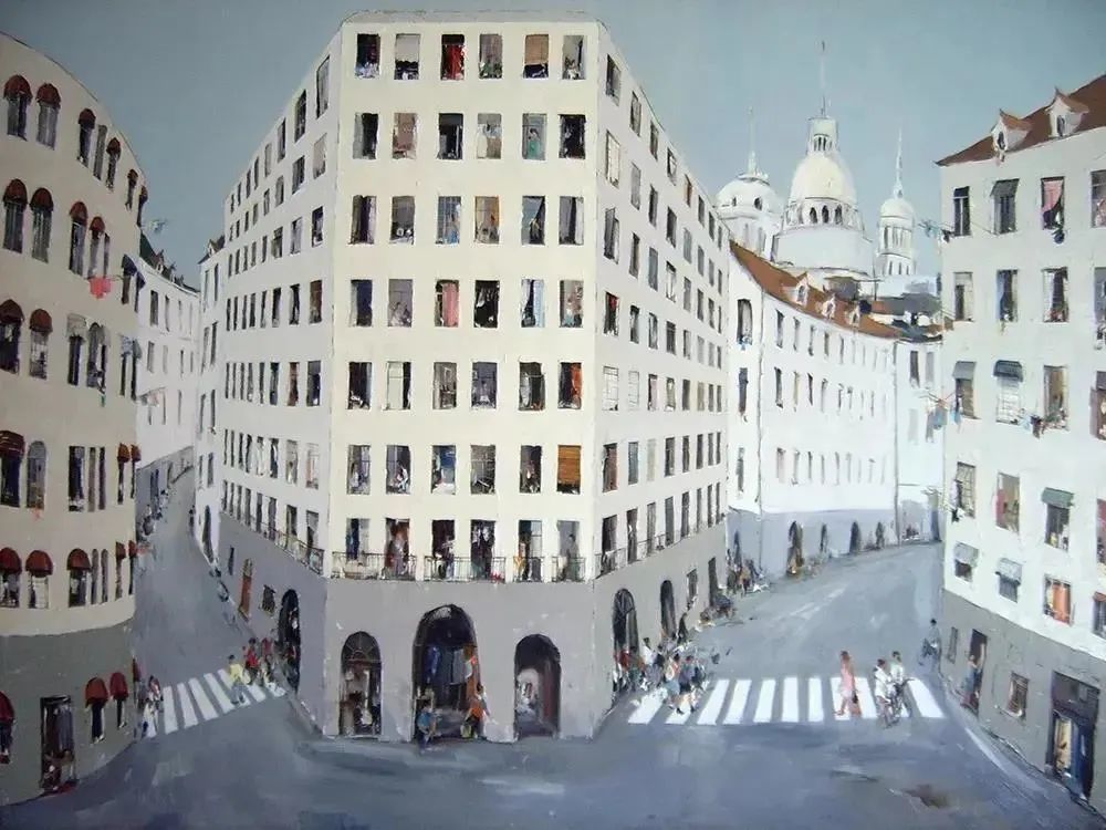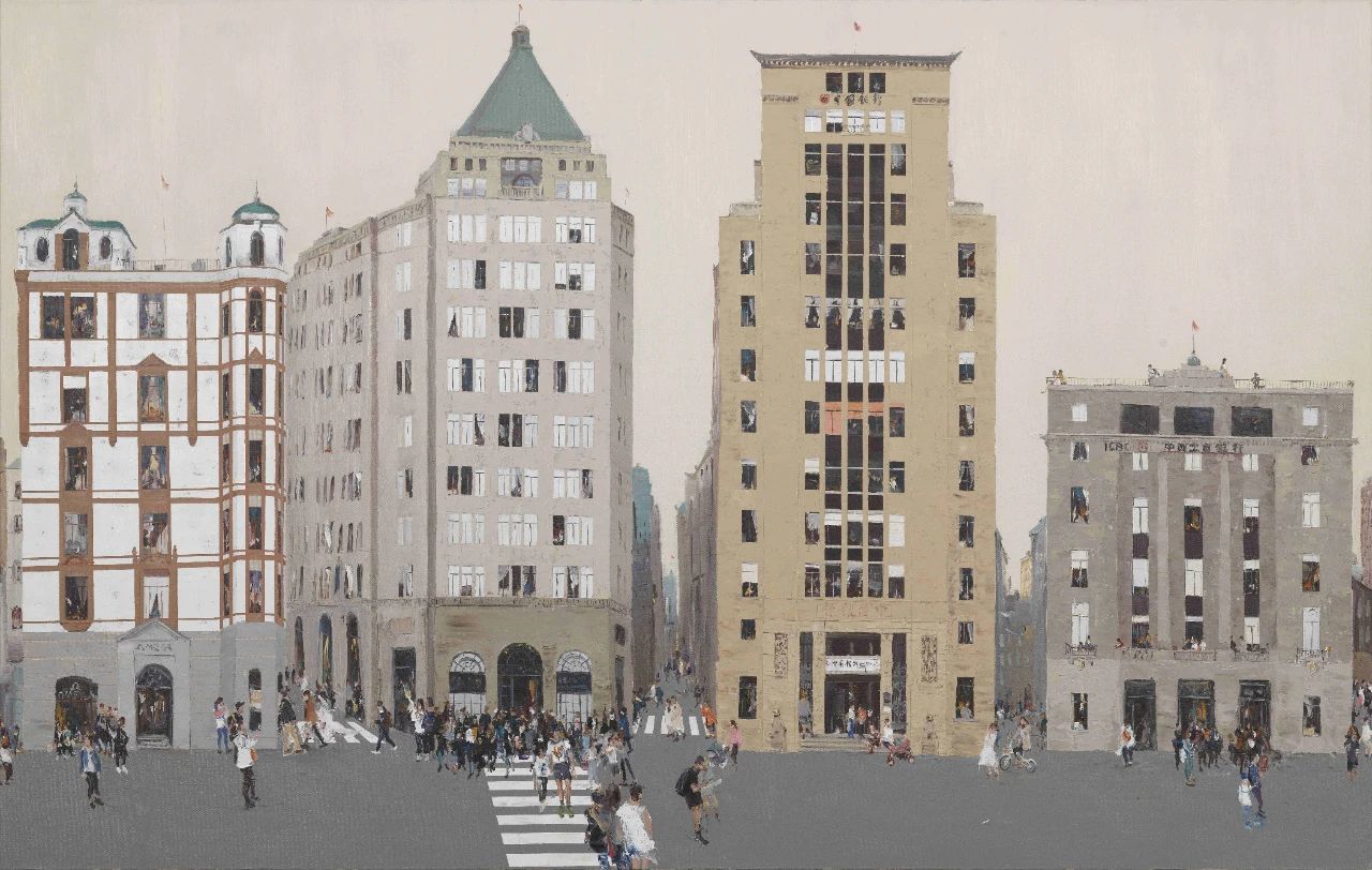 城市建筑独立于自然风景被描绘与热爱,以20世纪初的“巴黎之子”郁特里罗为最,他的街景画将宁静美丽的巴黎封藏。21世纪初,上海这个建筑的万国城迎来了杜海军,远至屹立近百年的武康大楼、国际饭店,近至商品房时代来临后所建的普通民居,在画家笔下展现出别样的风貌。有别于郁特里罗的躲避人群,杜海军的画面里“挤”满了人。生活在此地的人们不由得惊诧,这整齐排列的窗棱,这垂直堆积的楼宇,那一个个晶莹剔透的玻璃盒子,不正是我们蝼蚁众生与城市浮华共生的写照吗?