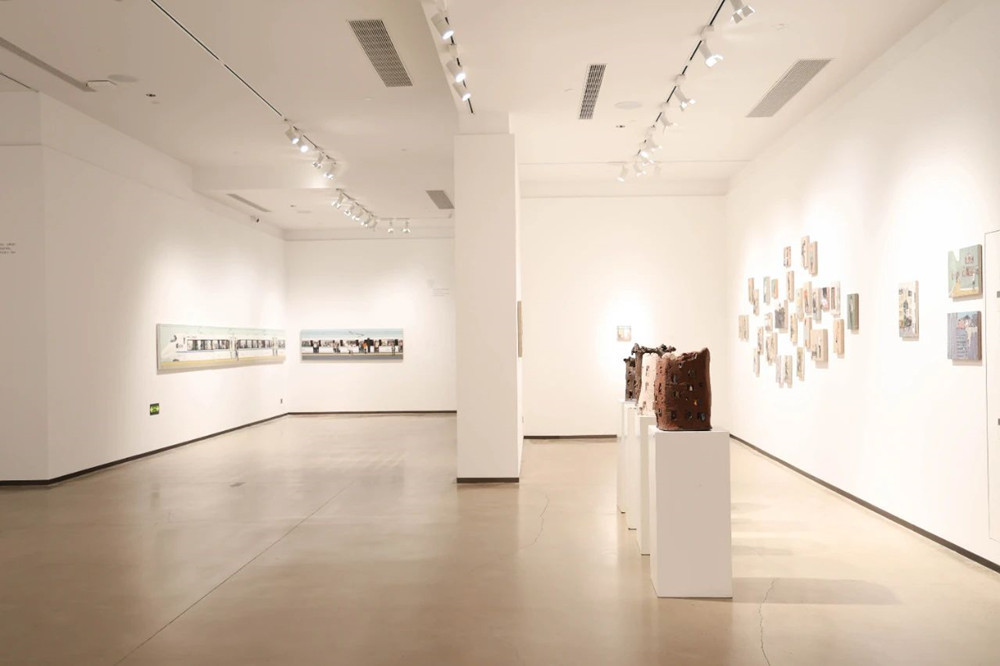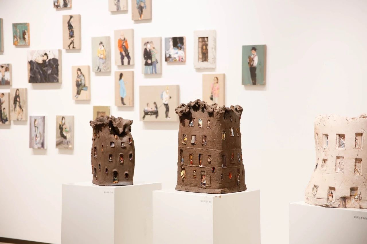他对材料的运用常常独辟蹊径,令人耳目一新。布面油画斑驳的肌理来自古老的层层罩染的坦培拉,铝板油画折叠的空间归功于工业铝材的反光照射。偶然间他遇到了朽腐的船木,便将其塑造为楼宇的横截面,至于家乡宜兴的紫砂陶土,他更是信手拈来装点上小人偶,将油画不可触摸的细节放大至观者眼前。