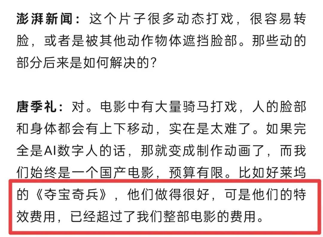导演唐季礼在接受采访时表示,“好莱坞的《夺宝奇兵》,他们做得很好,可是他们的特效费用,已经超过了我们整部电影的费用。”