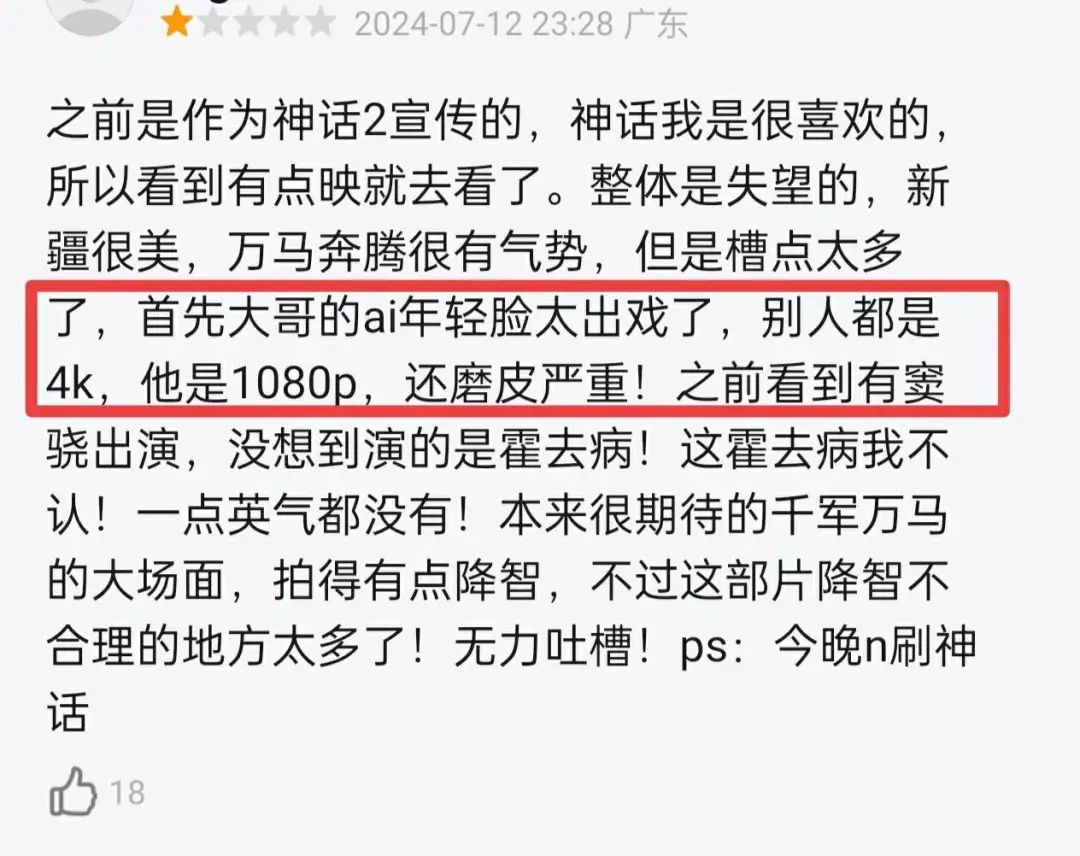 在电影院的大银幕上,AI脸的瑕疵被几百倍的放大了。当AI成龙和别人同框时,只有AI成龙脸上有明显的磨皮效果,甚至磨到不在一个清晰度,“别人都是4K,他是1080P”。