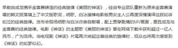 《神话》的商业性确实拉满了,电影本体的海外版权收益超千万、搭片广告费上千万、《美丽的神话》歌曲网络下载获利超过一亿元,再加上后来的电视剧改编版权收益,剧版男主还由成龙钦点长得像他的胡歌饰演。整个项目都有种“赚翻了”的美。