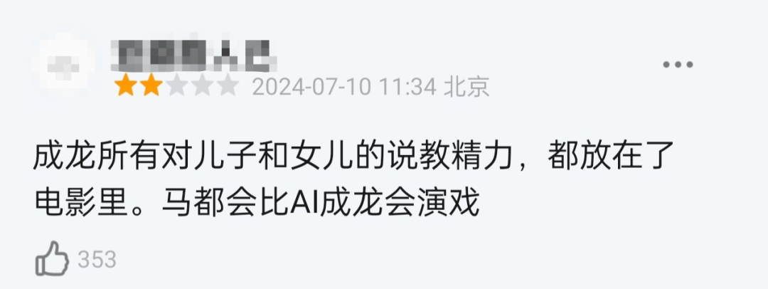 有人说,AI成龙就是“美颜版的僵尸脸”,花投资人的钱打“人类史上最贵的美容针”,效果是“半永久微笑唇”,最后得出结论——“马都比AI成龙会演戏”。