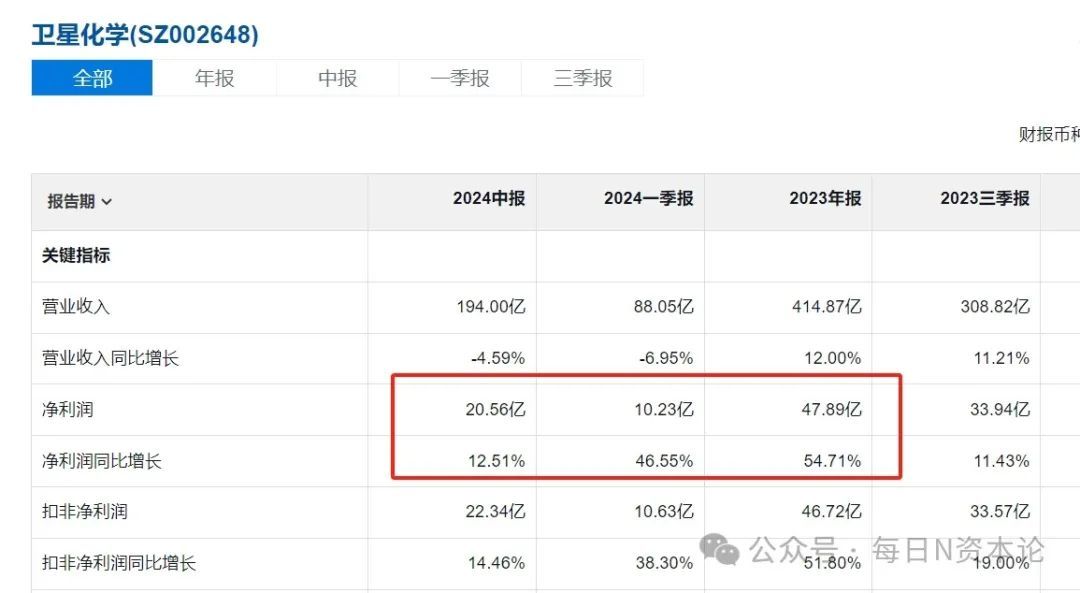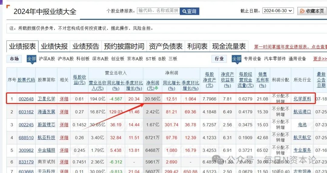近日,深市主板首份2024年半年报出炉,卫星化学股份有限公司(下称,卫星化学)披露的数据显示,今年上半年其实现营收194亿元,同比下降4.59%;净利润20.56亿元,同比增长12.51%;扣非净利润22.34亿元,同比增长14.46%。截至7月25日,卫星化学的净利润在沪深两市已经公布的上市公司中排名第一,成了“最赚钱”的公司。