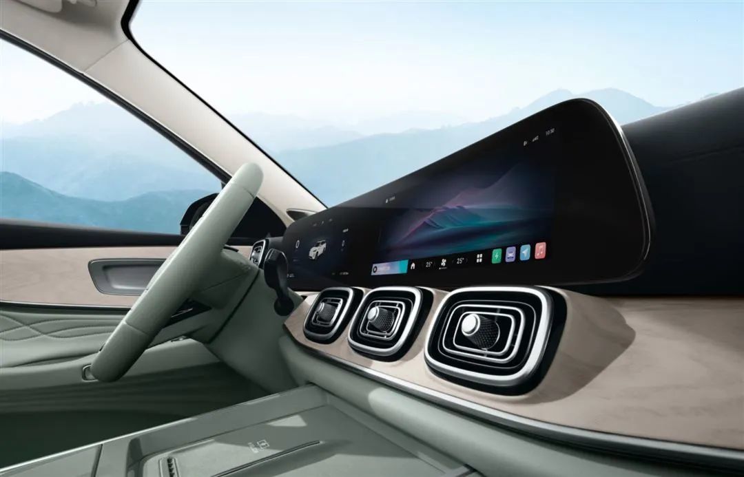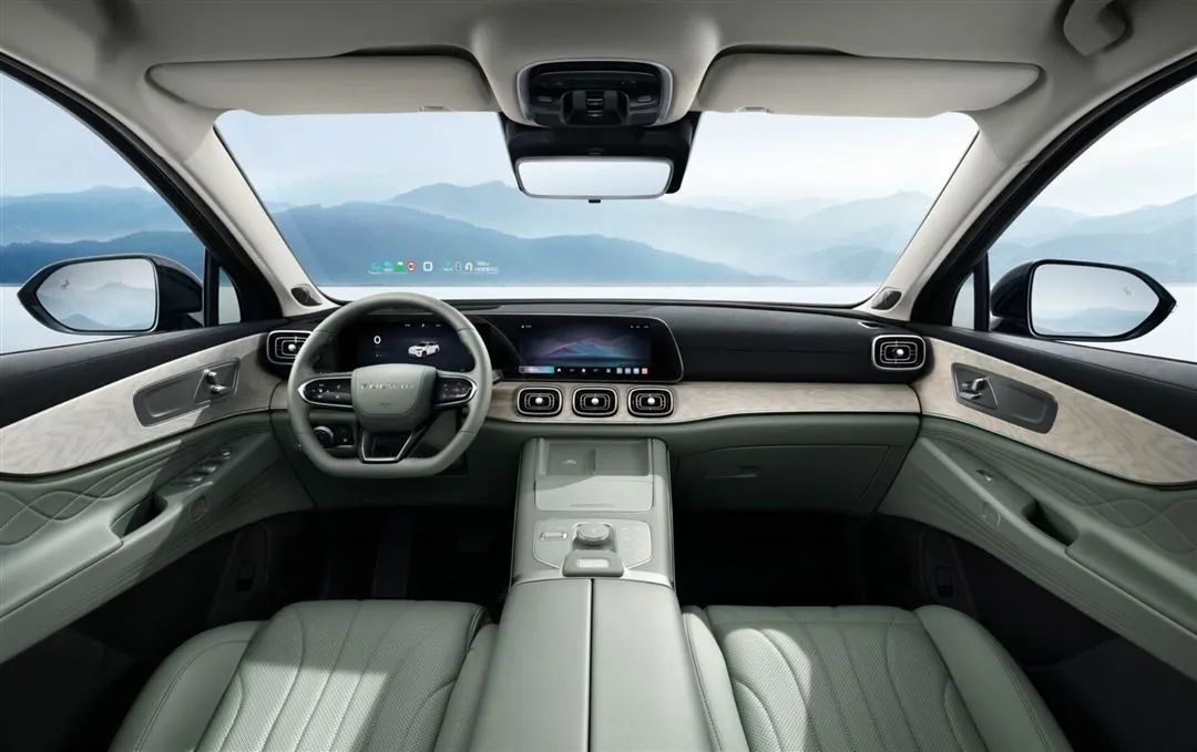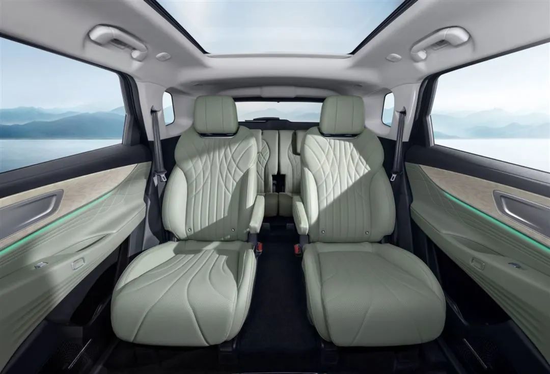 车内的风格和配色小编个人比较喜欢,很清新,很简单,还是老样子,你日常能接触到的位置都加入了软性材质,工艺也都不错。两种内饰配色分别为典雅暮光紫、格调山岚绿。全液晶仪表+大尺寸悬浮式中控屏组成的联屏设计也是当下大家都爱用的设计之一。大屏分辨率做到了2.5K,内部还有8155芯片,前面还有HUD、无线充电是50W的,座椅有通风加热按摩,该车将提供2+2+2和2+3两种座椅布局供消费者选择,二三两排座椅可以一键放到。