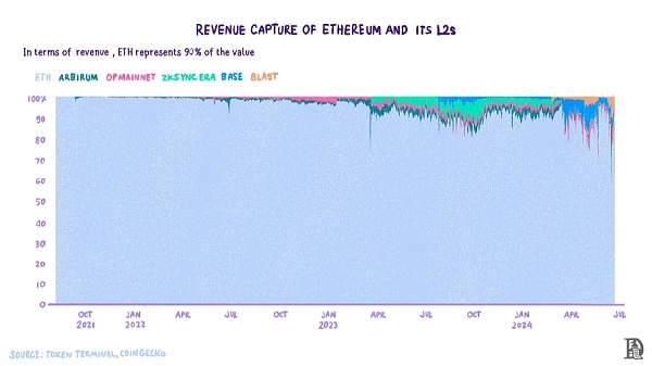 幸运的是,以太坊在过去的三年里一直在走这条路,我们可以观察到L2对以太坊价值获取的影响。可以通过两种途径理解L2是否是以太坊生态的掠夺者。