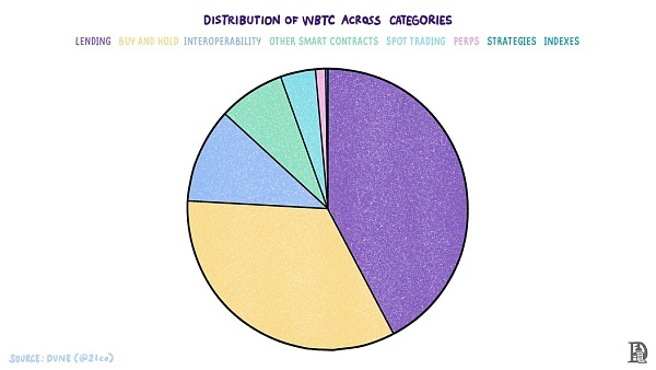 包装BTC(或WBTC)是不同DeFi生态中使用最广泛的BTC版本,市值约为100亿美元,不到流通中BTC总量的1%。这显示出存于BTC金融化中的机会。