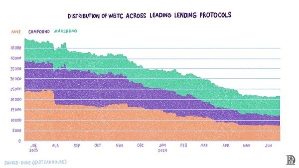 拥有超万亿美元市值的BTC甚至还没有触及到借贷市场的表面。借贷市场中的WBTC分布如下图所示。它表明,在2023年7月至2024年6月期间,前三大借贷应用中使用的WBTC数量从约50k下降到约23k。借贷应用程序中WBTC总量的下降可归因于WBTC供应量下降了48%,从2022年5月的28.5万WBTC下降到如今的仅超15万WBTC。这种下降主要是由于市场意识到了在Luna、3AC和Alameda之后中心化的各方带来的风险。