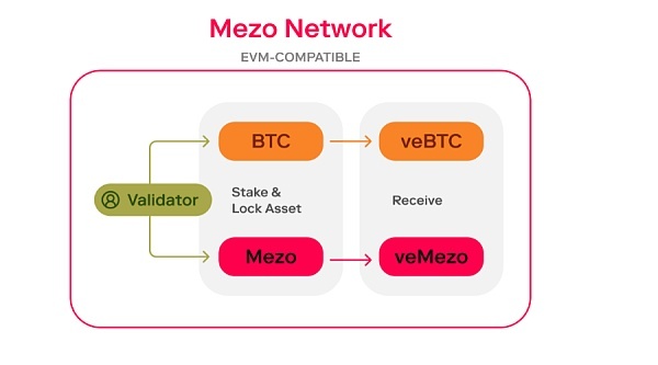 Mezo拥有一个双重质押模型,如下图所示。网络上的验证者们可以质押BTC和MEZO(MEZO网络的原生代币)。通过质押BTC和MEZO,验证者分别获得veBTC和veMezo。“ve”代表validator escrowed(验证者托管),这些代币通常被锁定在智能合约中。验证者托管的代币持有者拥有治理权,网络奖励和费用收入是与他们共享的。