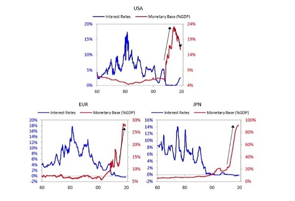 上图显示了自上世纪80年代以来发达国家利率的下降情况。与此同时,货币基础占国内生产总值的比例也在增长。因此,总产出的增长速度赶不上货币供应量的增长速度。当货币供应量迅猛增长时,无论家庭收入增长率是否较低,都可能导致更高的通货膨胀、更高的生活成本、更多的债务负担和更严重的收入不平等。我们目前所处的高通胀环境是央行所采取的政策的结果。