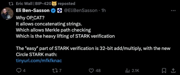 像Starkware这样的团队已经指出OP_CAT可以为比特币带来STARK验证。这意味着比特币可以验证ZK证明,从而支持rollup。这种设计范式不仅允许在比特币上进行通用设计,而且还提高了比特币迫切需要的可扩展性。