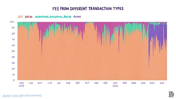 Ordinals协议是一种利用比特币UTXO的方式,它以不同的方式看待单个Satoshis(BTC的最小单位),它带来了像铭文(比特币上的NFT)这样的创新。对序数和铭文的热情催生了BRC-20和符文等可替代标准的演变。铭文和符文推动了比特币活动。仅BTC转账,每日总交易量就增加了70%。