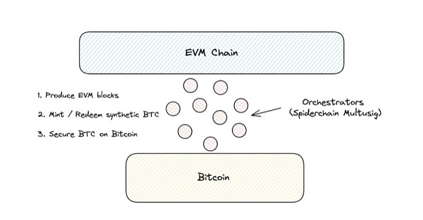 Botanix团队带来了一项重大创新:Spiderchain。Spiderchain是什么?它是Botanix上协调节点的滚动多签。让我们来具体分析一下。正如我们前面提到的,L2需要一个桥和一个执行交易的链。协调节点将用户的资金安全保存在比特币上,并为用户铸造和燃烧合成BTC(在EVM层上)。Orchestrators(协调者)运行比特币和Spiderchain EVM(Botanix)节点。