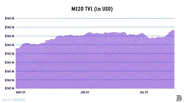在推出的第一阶段,Mezo已经开始接受三个锁定期的BTC存款,分别为:两个月、六个月和九个月。存款以HODL分值积累积分。一个BTC每天产生1000积分,乘数与锁定期相关。锁定期越长,乘数越高。用户还可以存入其他资产,如USDe、USDC和USDT,以提高他们的BTC存款。截至2024年7月,Mezo的TVL为1.35亿美元。