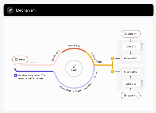因此,对在Stacks上生产区块感兴趣的比特币矿工需要发送一些BTC。一个矿工,比如Alice,被随机选中在Stacks上生产区块。来自该矿工的BTC被给予那些锁定/持有STX的用户,STX是Stacks链的原生代币。这很有趣,因为虽然收益很小,但却是BTC。在大多数链上,收益仅使用链的原生代币提供。