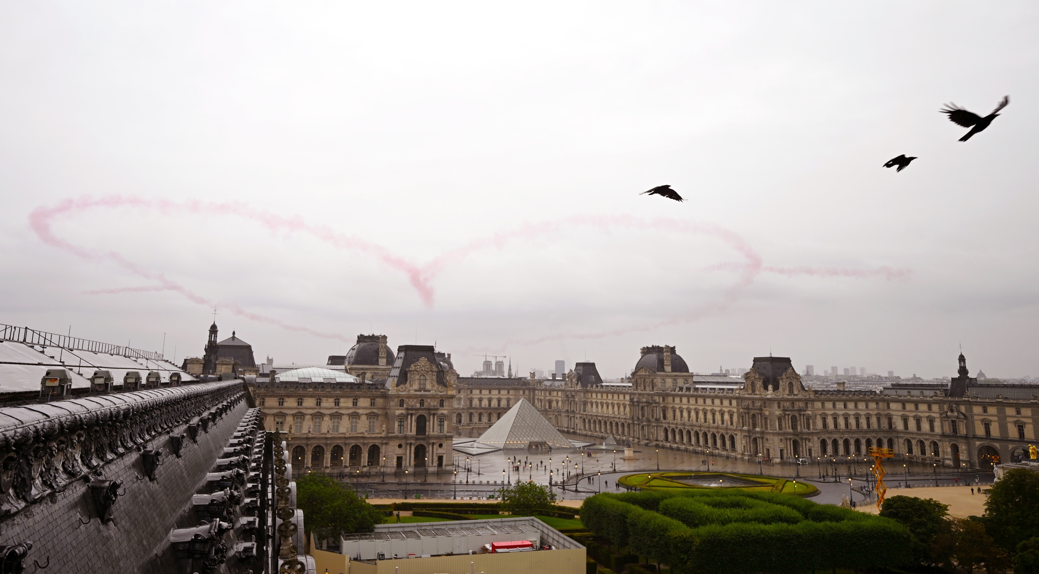 开幕式上飞机拉出的心形烟雾漂浮在巴黎圣母院上空。