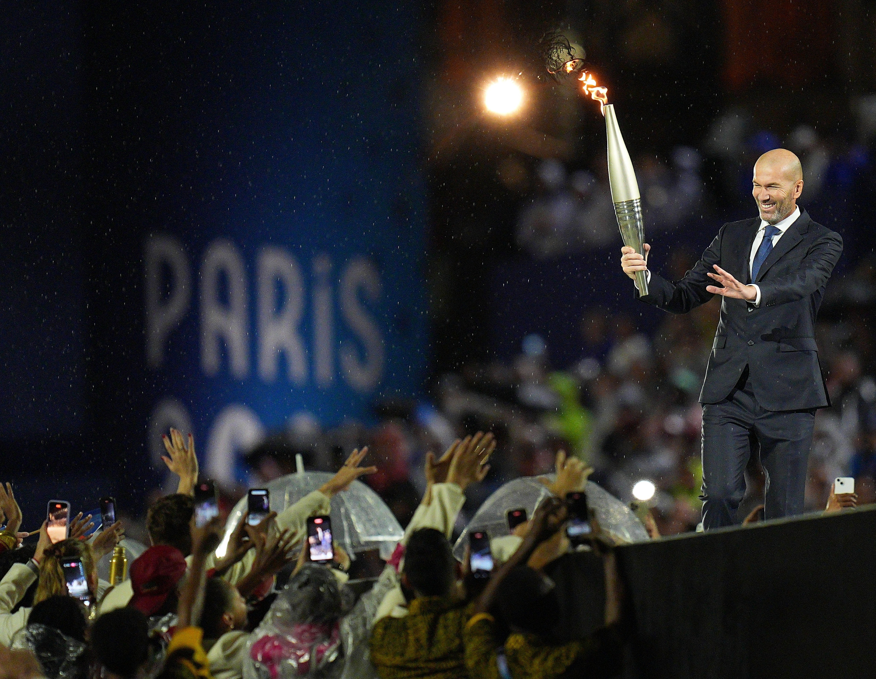法国足球名宿齐达内手持奥运火炬传递。