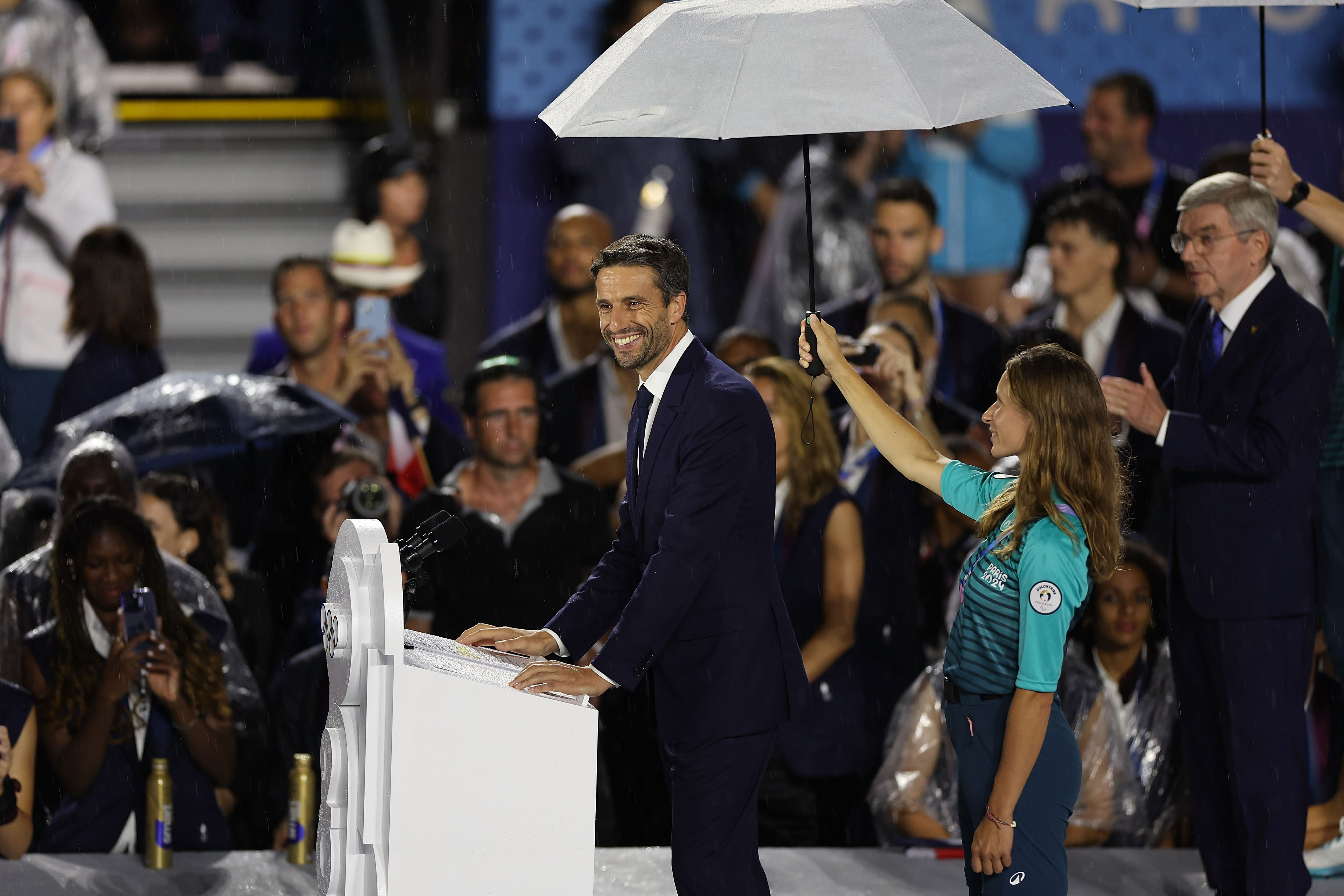 巴黎奥组委主席托尼·埃斯坦盖(前左)在开幕式现场致辞。