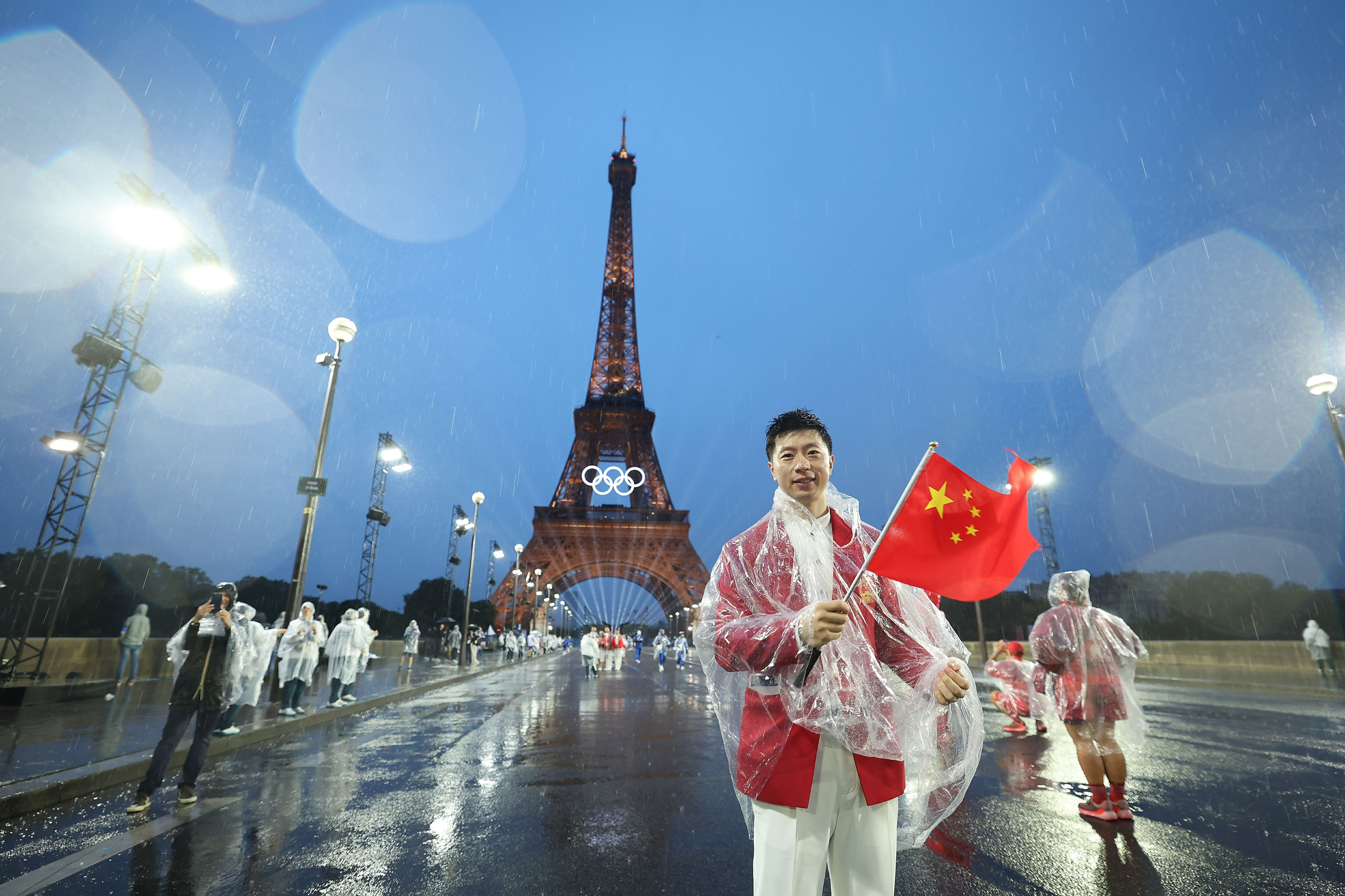 中国体育代表团旗手、乒乓球选手马龙在埃菲尔铁塔前。