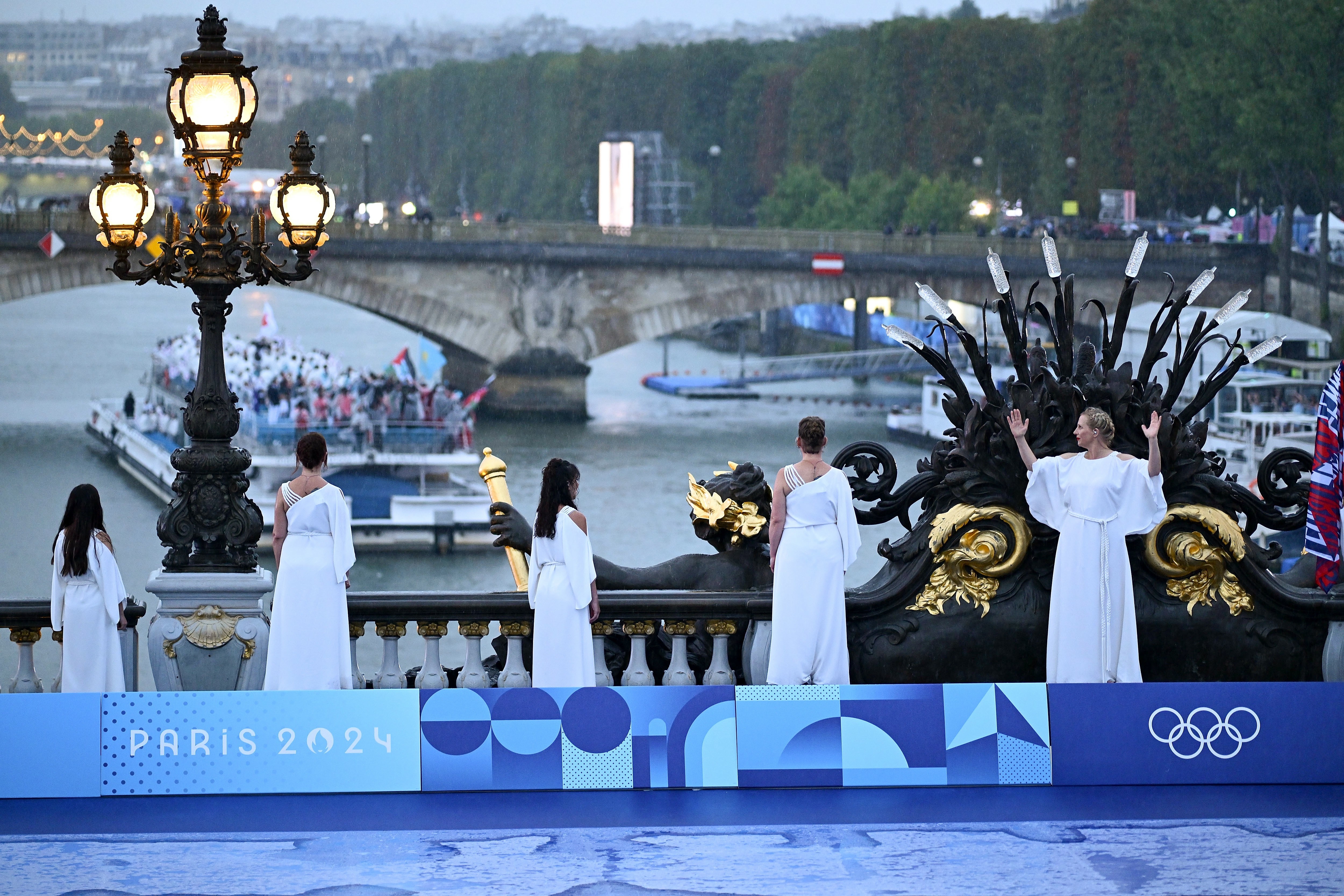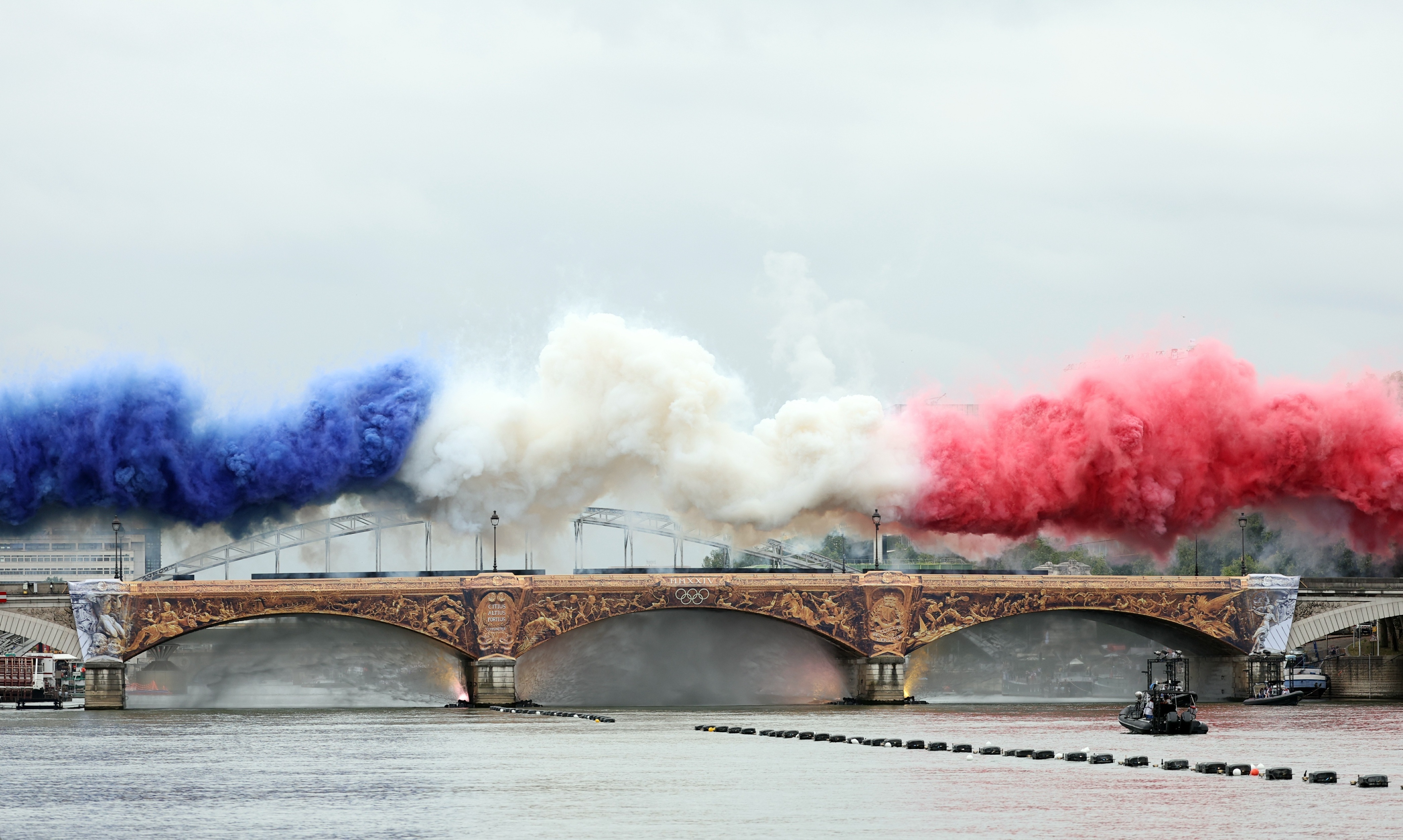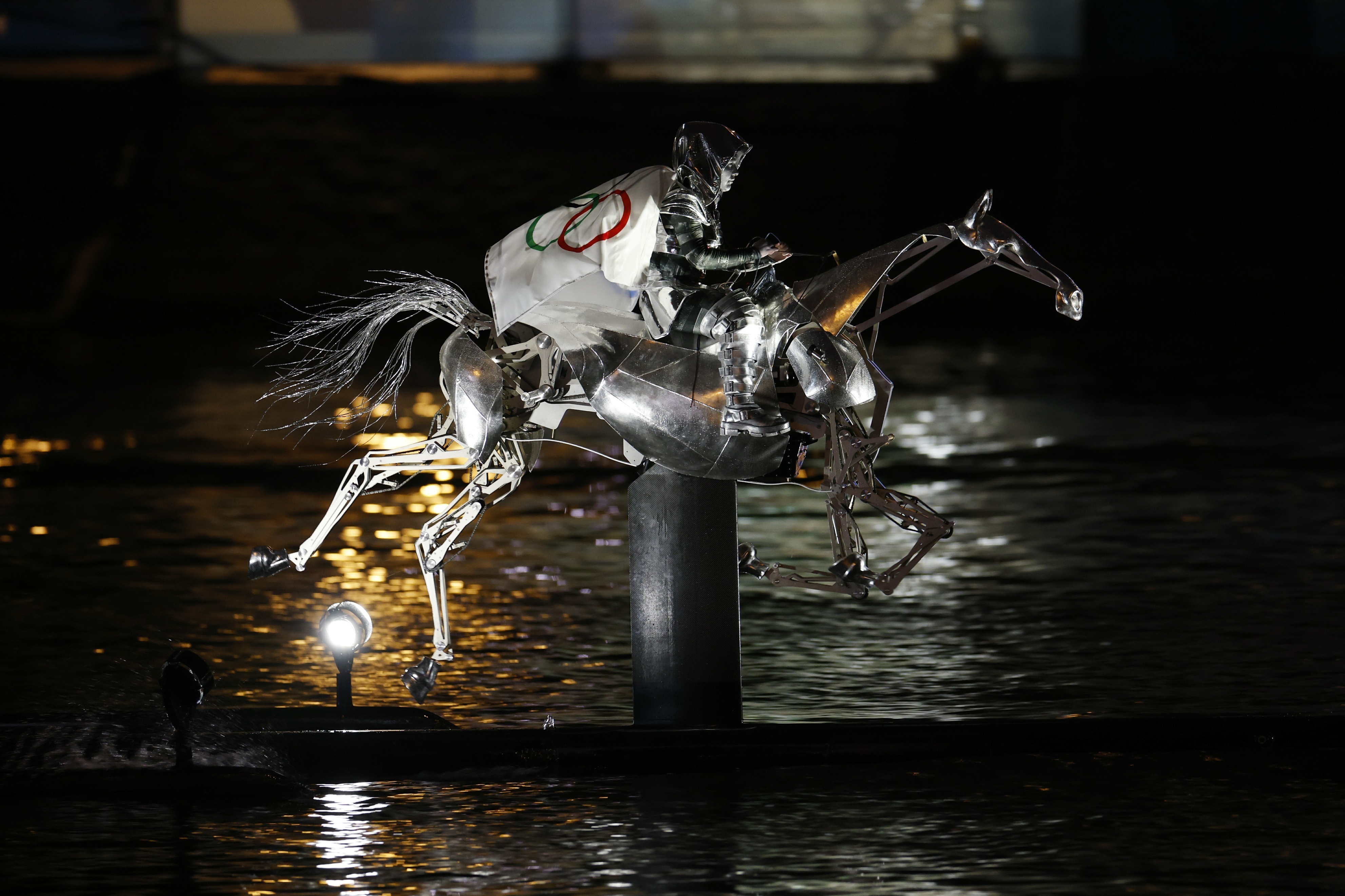 女骑手弗洛里亚娜·伊塞尔身披奥林匹克五环旗沿着塞纳河“疾驰”。
