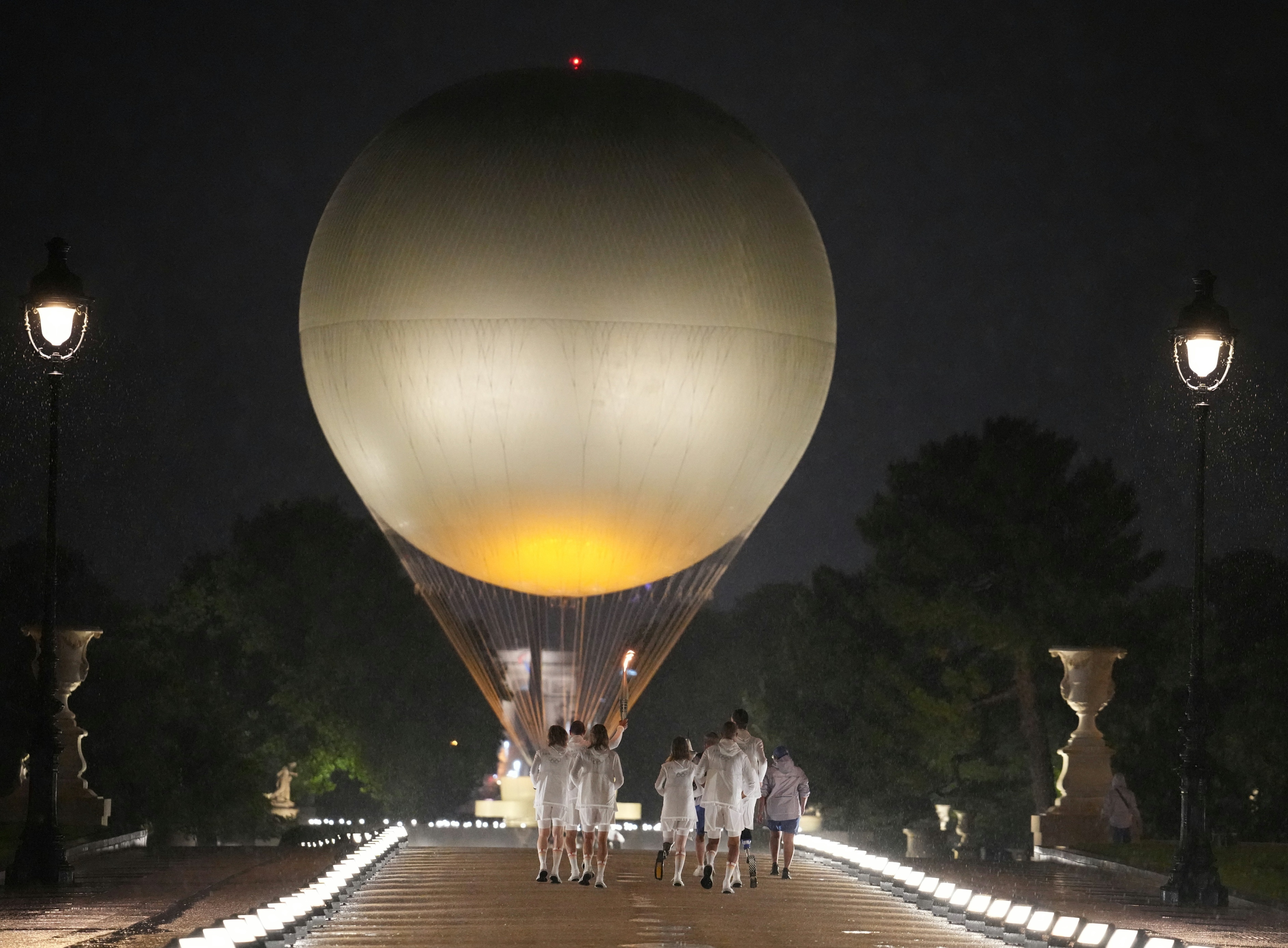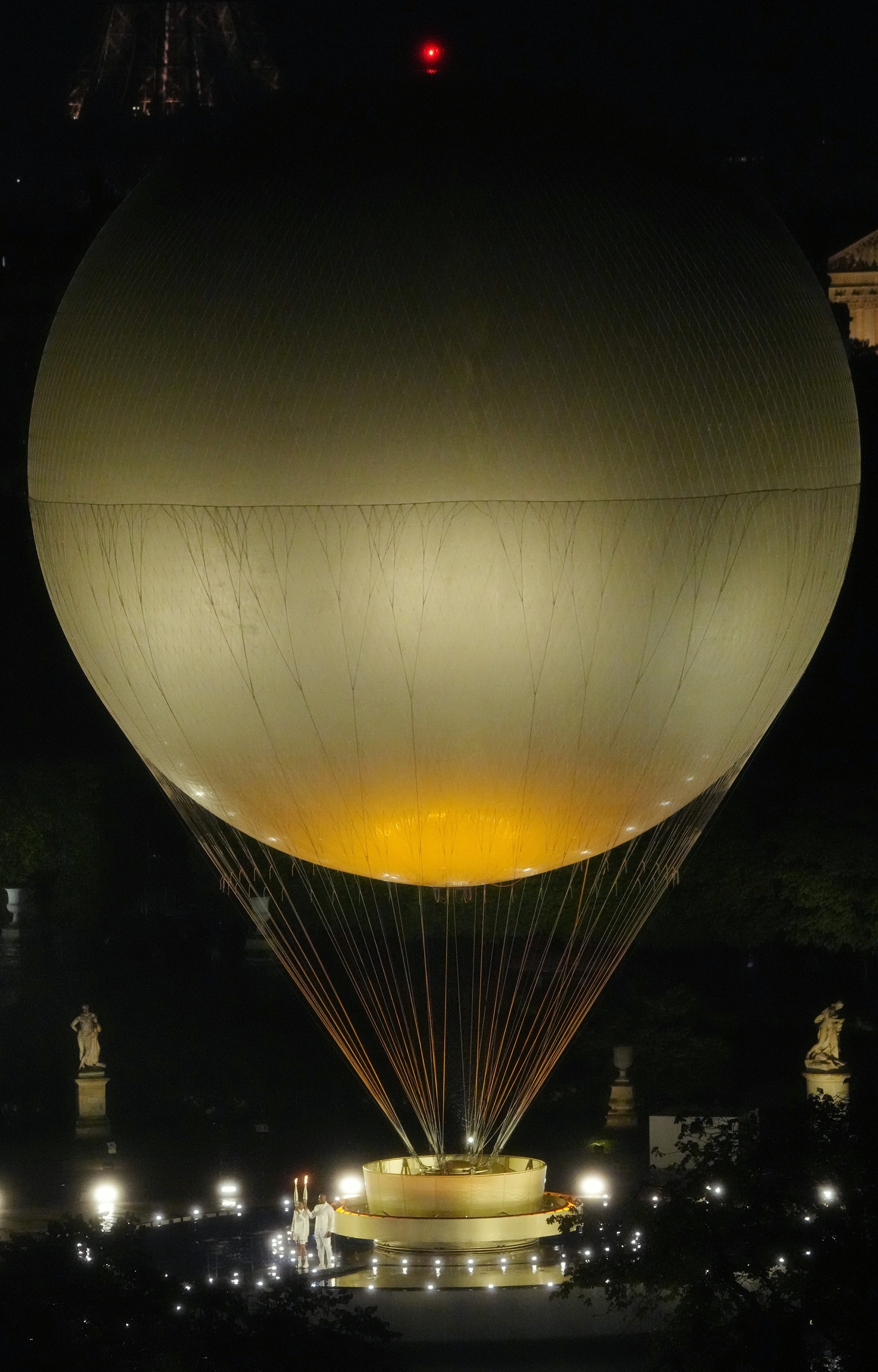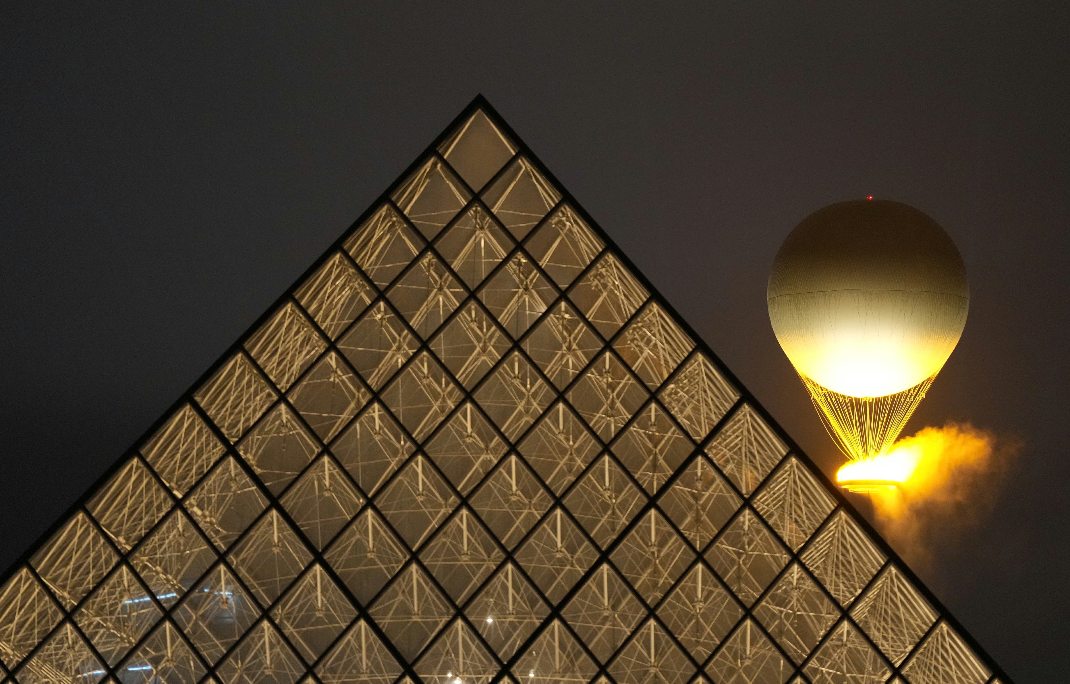 热气球状的主火炬在卢浮宫的玻璃金字塔前点燃。