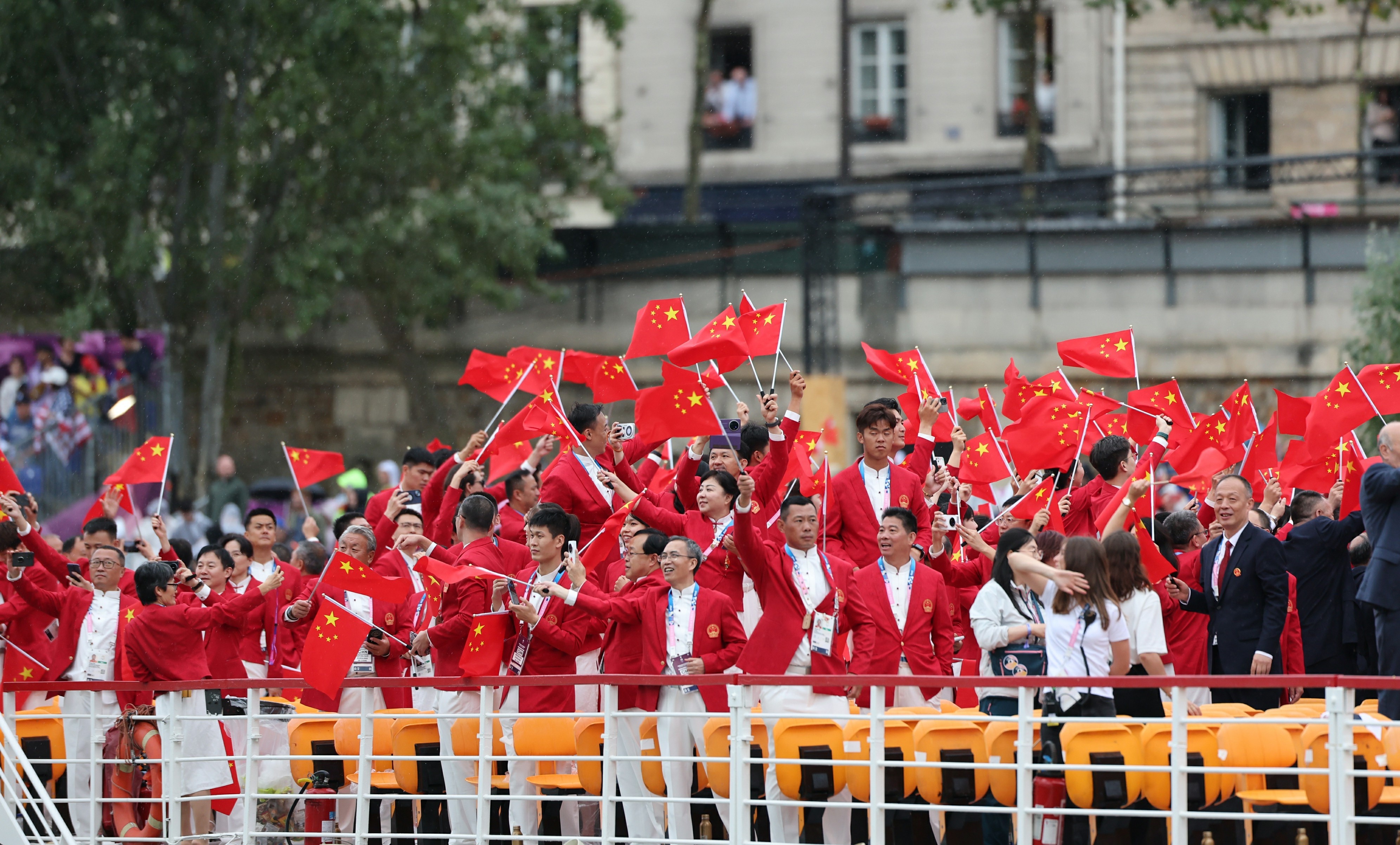 中国体育代表团成员在开幕式现场。