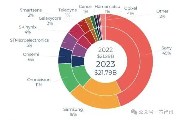 排名第二至第四的分别是三星、豪威科技、安森美,市场份额分别为19%、11%和6%,均与2022年持平。