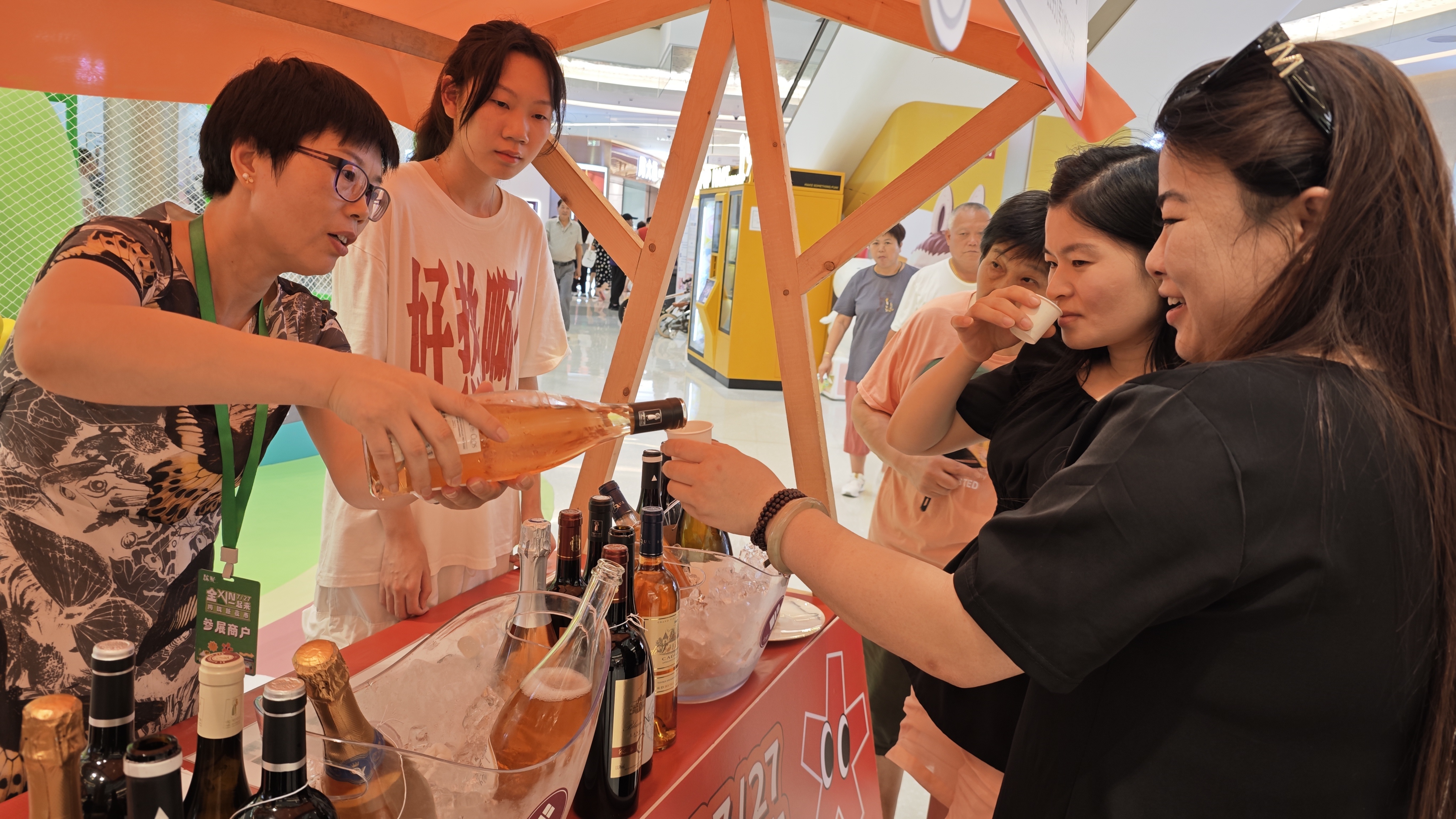 此次夜市共分食品区、百货区、赏物区、体验区4个区域,精选梅陇镇域内40家“两企三新”企业齐聚力波九坊。每一位来夜市的游客都能收获到饮品、轻食、蔬菜、水果、鲜花、盆景、美妆饰品等各类好物。除了购物之外,现场还提供有医美、手作体验、小物维修等公益服务。