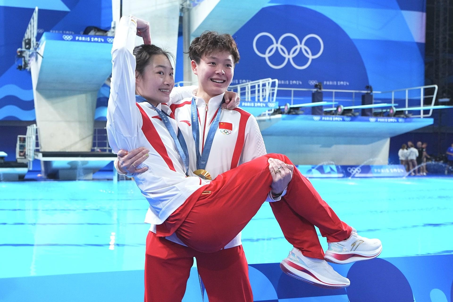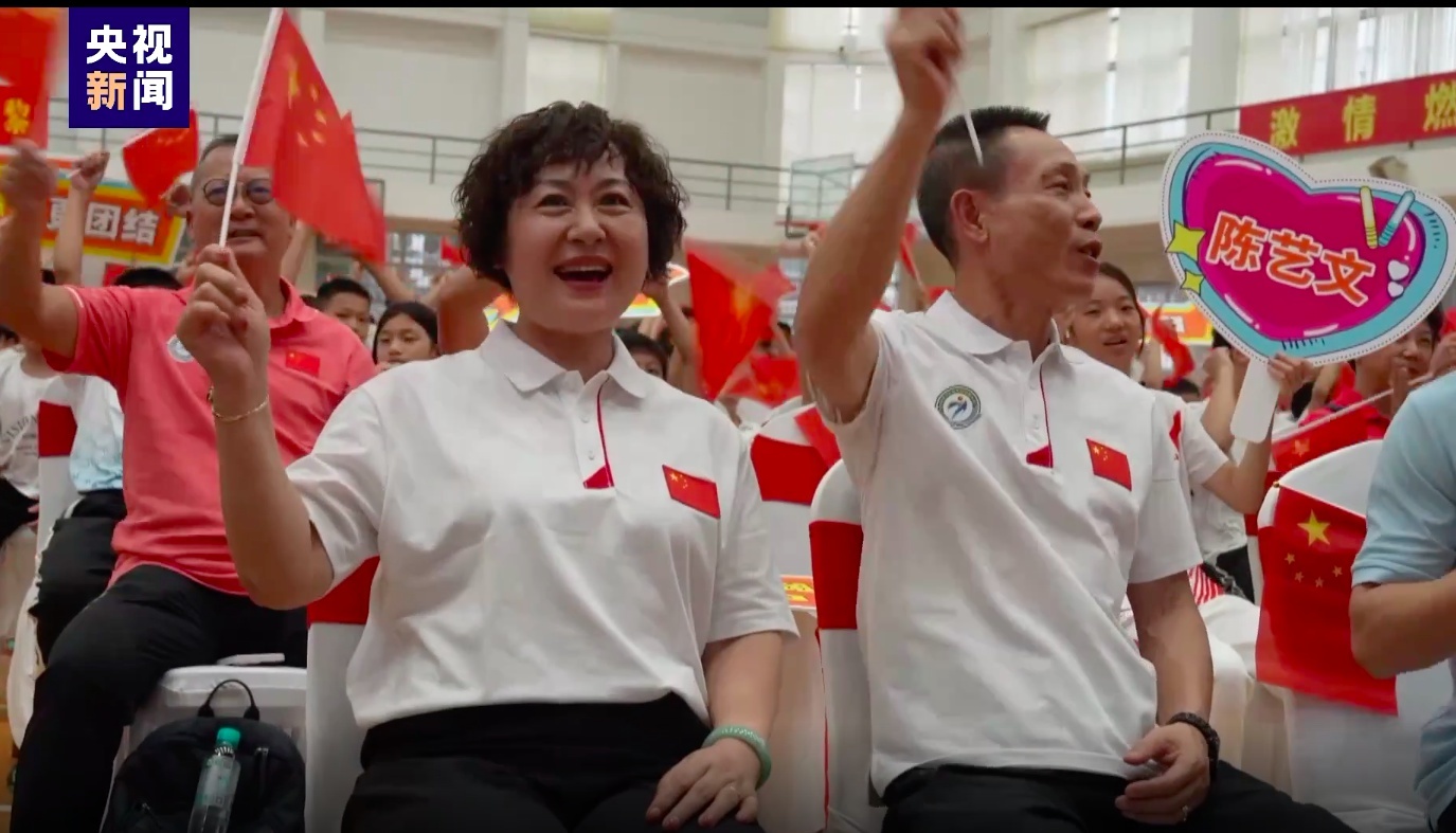 在陈艺文和队友昌雅妮为中国队锁定巴黎奥运会跳水女子双人3米板金牌后,全程观看比赛直播的陈艺文家人一跃而起,相拥而泣。