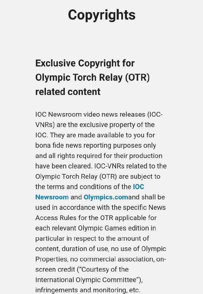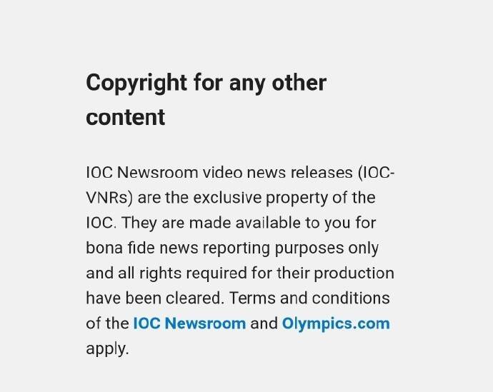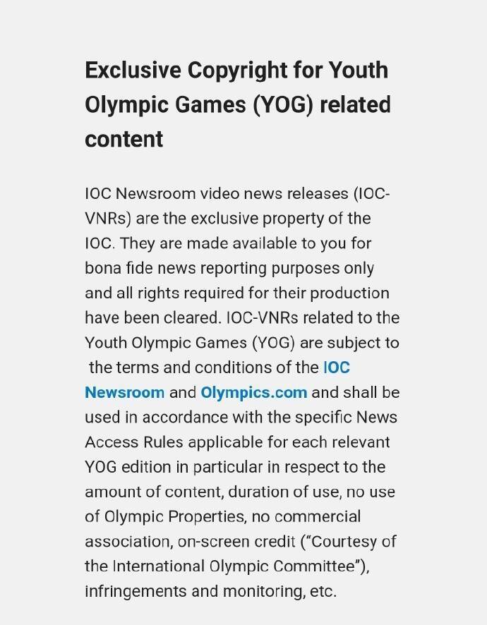 也就是说包括奥运火炬传递(OTR)国际奥委会新闻室视频新闻稿(IOC-VNR)青奥会(YOG)是国际奥委会的专有财产,是属于独家版权。相关奥运会版本的具体新闻访问规则、使用内容数量、使用时长等等都是属于奥委会的,需要使用的话必须要经过奥委会授权,不能存在商业关联,还要在屏幕出处明确打出“由国际奥委会提供”。哪怕您是奥林匹克官方运营但是是在YouTube上分发,YouTube这个平台又没有奥林匹克官方的授权,那实际上也是违反了独家版权的规定的。