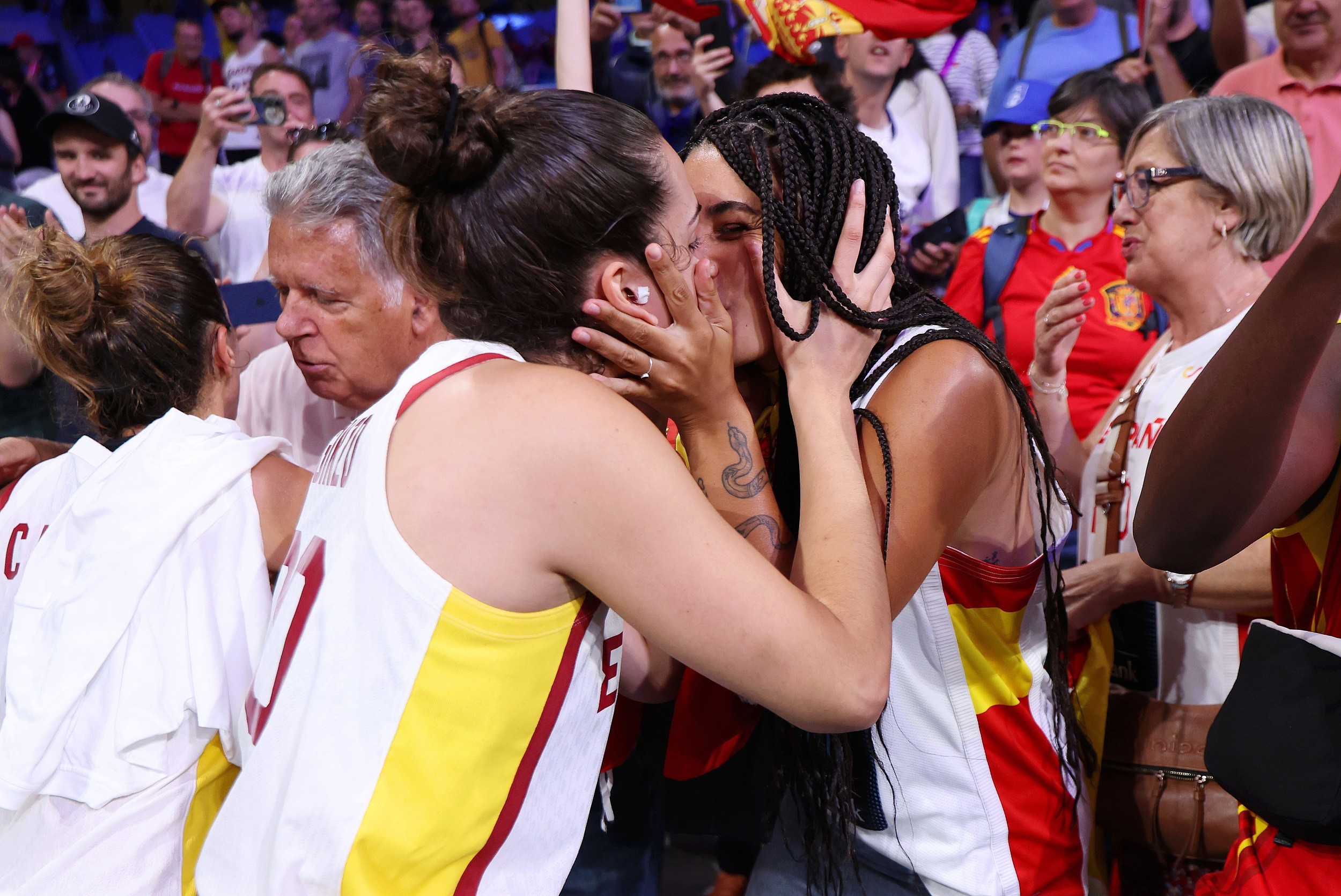 北京时间7月28日,西班牙女篮90-89战胜中国女篮,拿下奥运会女篮开门红,赛后西班牙女篮球员激动不已,和场边友人亲吻庆祝。