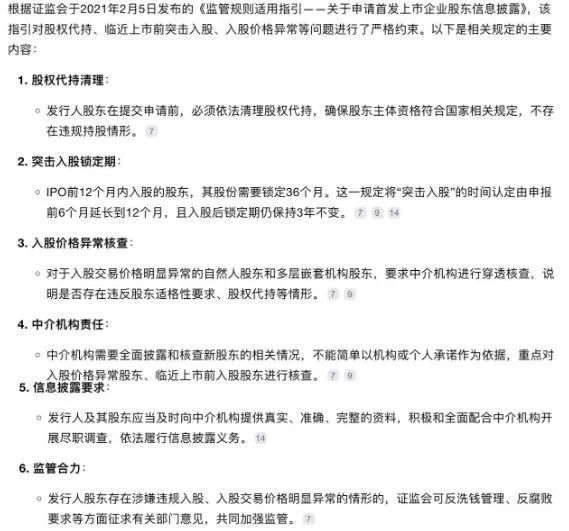 近年来,监管部门对突击入股的核查日趋严格。证监会特意发布相关规定,重点约束股权代持、临近上市前突击入股、入股价格异常等市场反映集中的问题。