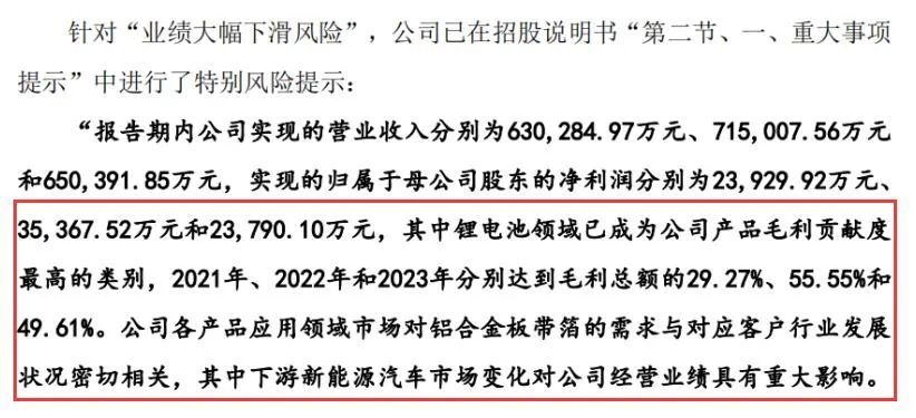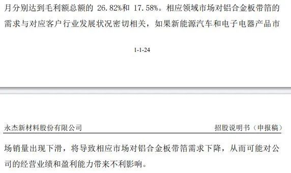 永杰新材在招股书中表示,如果新能源汽车和电子电器产品市场销量出现下滑,将导致相应市场对铝合金板带箔需求下降,从而可能对公司的经营业绩和盈利能力带来不利影响。