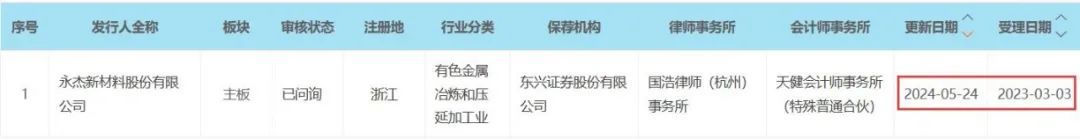 距离最近一次问询已经过去两个多月,永杰新材的IPO进程依然停留在已问询阶段。