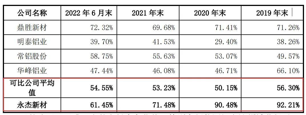 那么,从行业看是个什么情况呢?可比公司资产负债率均值在50%-57%之间,而永杰新材明显较高,尤其是2019年和2020年,资产负债率均在90%以上。