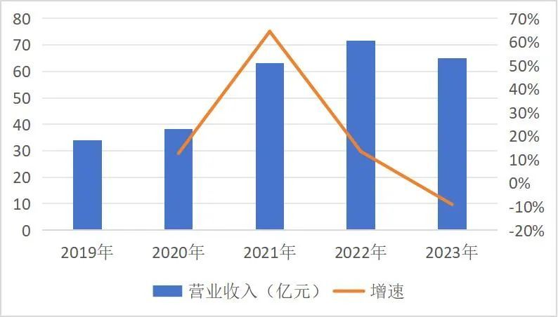 然而,这种趋势在2023年发生了变化,当年营收下滑至65亿元左右,净利润也降至2亿多元,同比分别下降9%和33%。