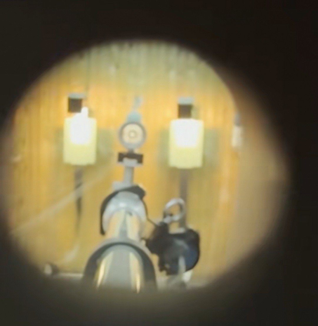 答案是不能。气步枪的瞄准镜没有放大功能,也没有十字,第一视角如下。运动员只能凭借瞄准镜中的前后觇孔和肉眼来进行瞄准,更多地依靠长年累月的刻苦训练培养出来的超乎视觉的“瞄准感觉”。